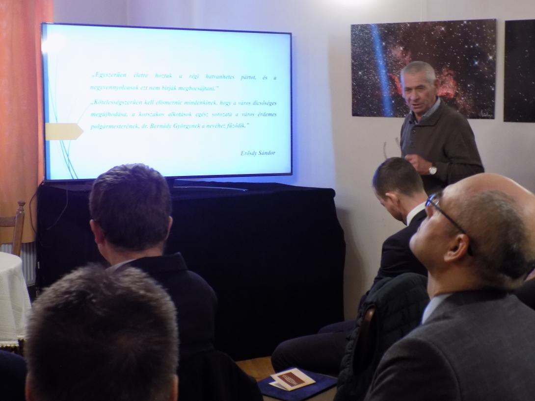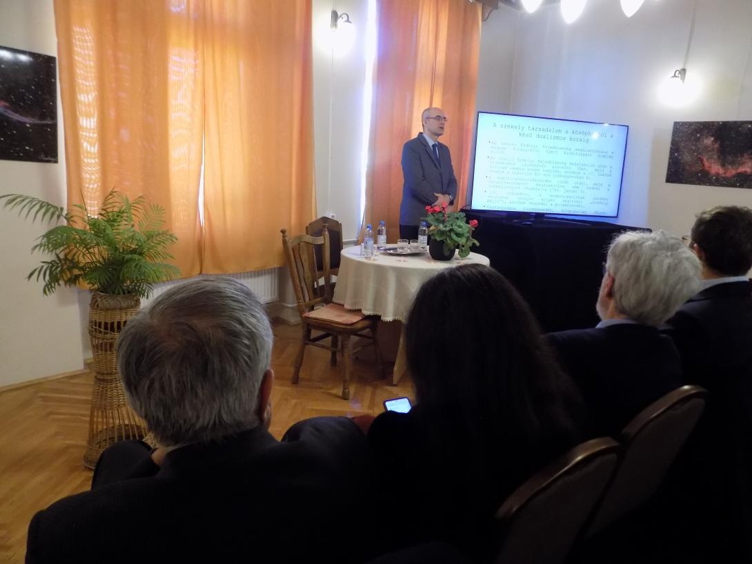 Az ünnepi köszöntőket a konferencián részt vevő tudósok előadásai követték. Dr. Szakály Sándor, a VERITAS Történetkutató Intézet és Levéltár főigazgatója és Károli Gáspár Református Egyetem kutatóprofesszora, egyetemi tanár: gróf Tisza István egykori miniszterelnökről tartott előadást. Dr. Nagy Róbert, a Babeș–Bolyai  Tudományegyetem előadó tanára és a Magyar Történeti Intézet igazgatója a Zsil-völgyébe telepedett székelyek életkörülményeit, a szénbányászat kezdeteit ismertette a jelenlévőkkel.  A következő előadó Komán János  nyugalmazott maroshévizi tanár volt, aki Erősdi Sándornak Maros-Torda vármegye főispánjának (1871 – 1937) az életútját és politikai tevékenységét mutatta be. Dr. Garda Dezső nyugalmazott egyetemi előadótanár Gyergyószentmiklós első, 20. századi polgármesteréről, Orel Dezsőről értekezett.