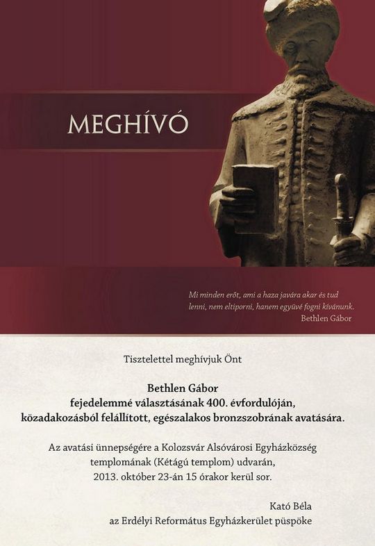 Bethlen Gábor erdélyi fejedelemmé választásának 400. évfordulóján a róla elnevezett Alapítvány emlékévet hirdetett, melynek keretében egészalakos bronzszobrot állítanak közadakozásból. A szobor felavatása Kolozsváron, október 23-án lesz az alsóvárosi református (kétágú) templom kertjében.