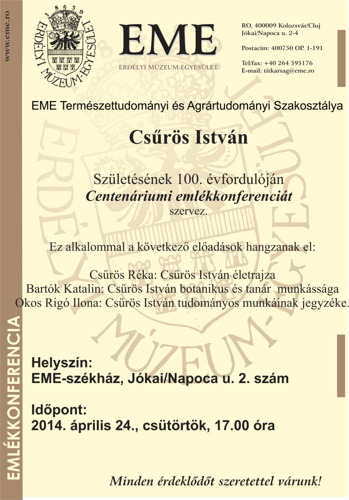 Születésének 100. évfordulóján, Csűrös István botanikusra emlékezünk az EME Természettudományi és Agrártudományi Szakosztályának közös rendezvényével.