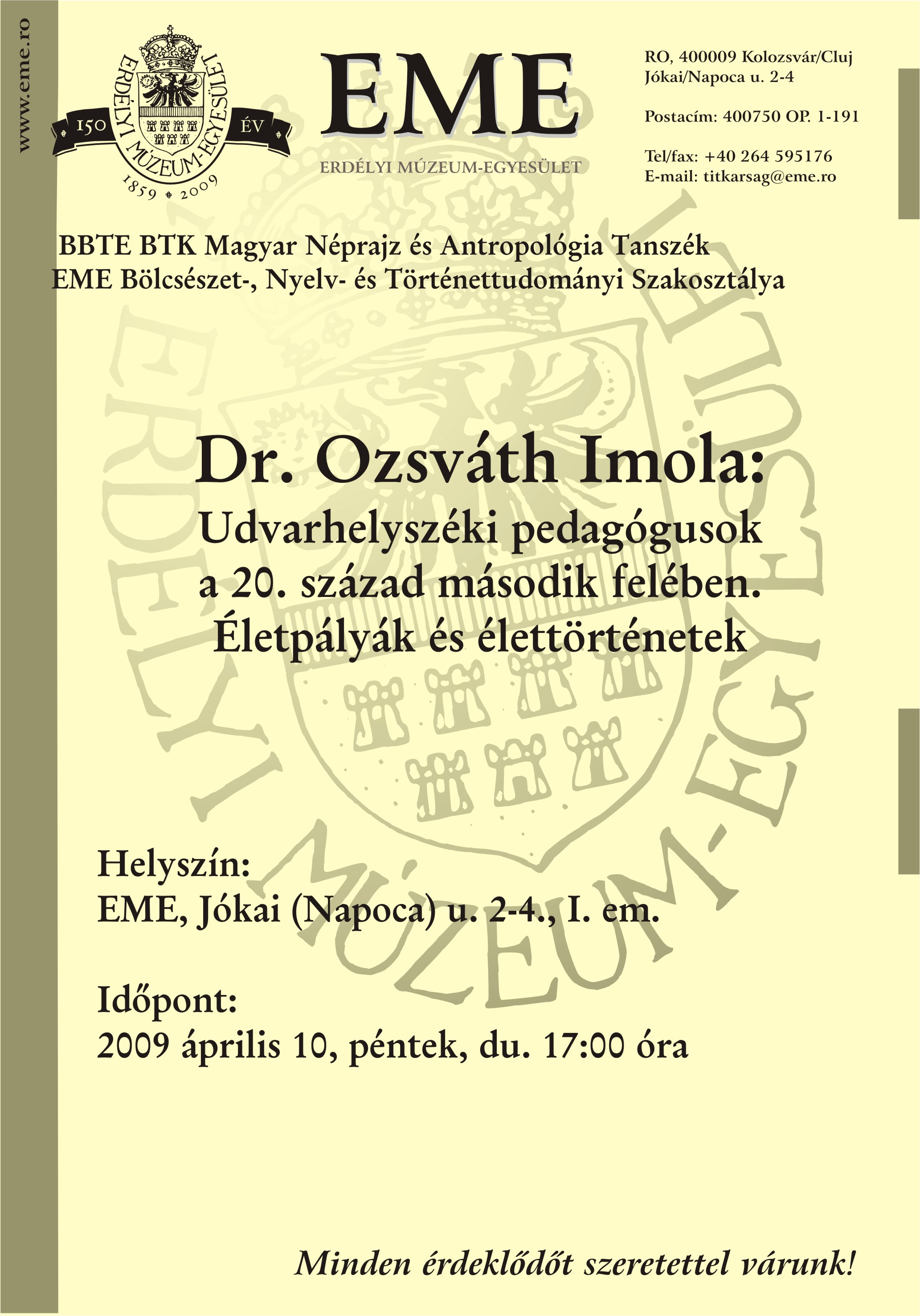 Helyszín: EME, Jókai (Napoca) u. 2–4., I. em.