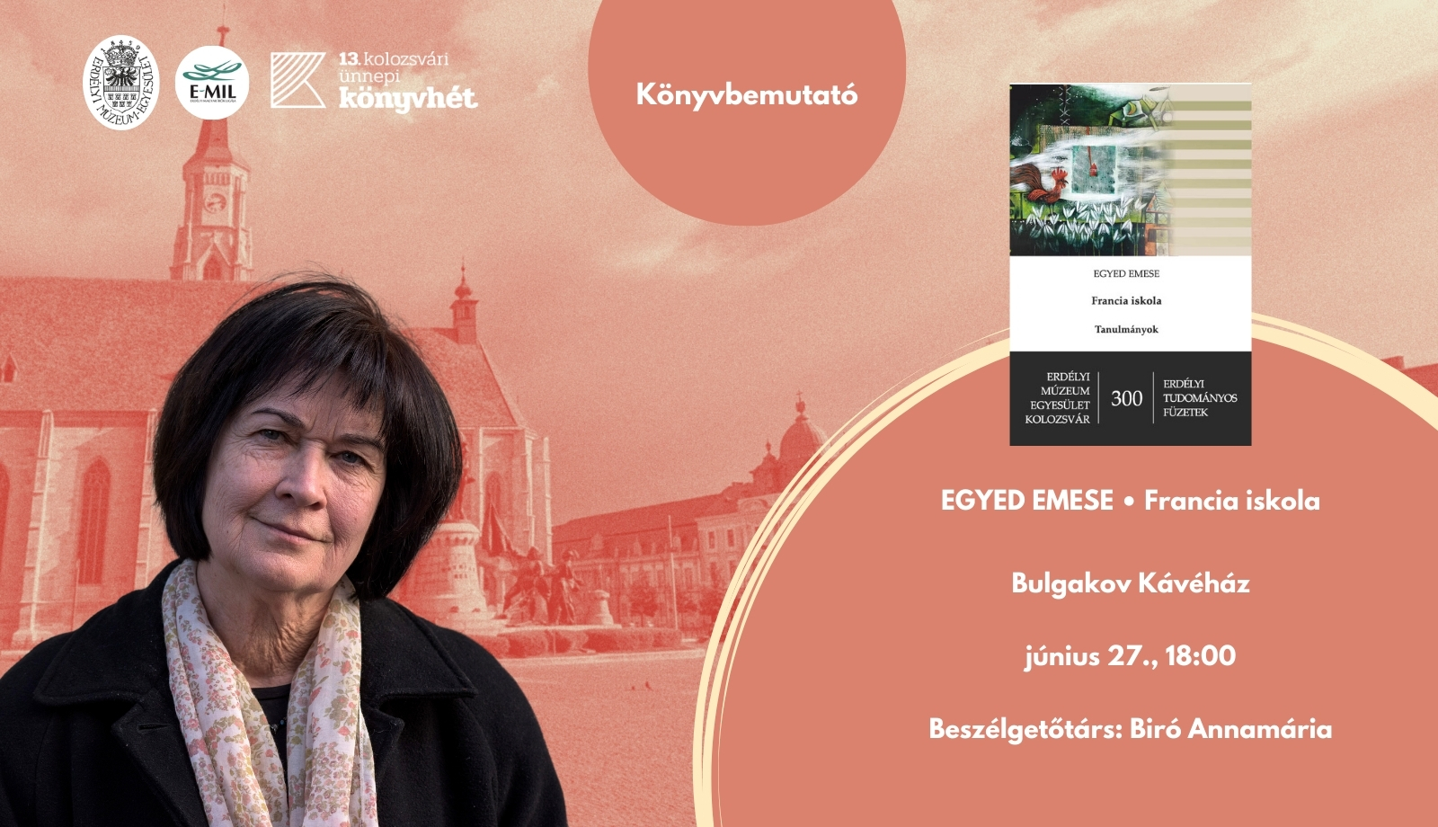 Erdélyi Magyar Írók Ligája szervezésében 2024. június 27-én 18 órától a Bulgakov kávéházban kerül sor Egyed Emese Francia iskola című könyvének (ami nem mellesleg az Erdélyi Tudományos Füzetek 300. kiadványa) bemutatására Biró Annamária közreműködésével.
