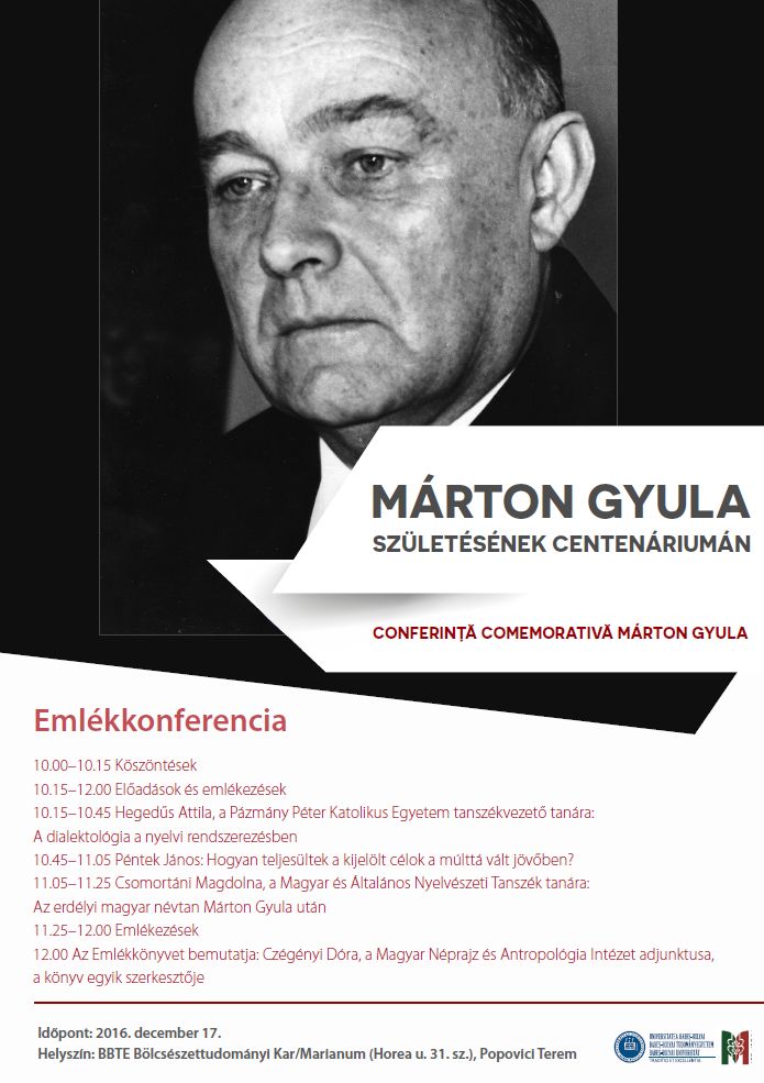 2016. december 17-én emlékkonferenciát tartunk Márton Gyula a kolozsvári egyetemi tanszék hajdani vezető professzora, a neves nyelvész születése 100. évfordulóján, és bemutatjuk az erre az alkalomra kiadott Emlékkönyvet. A konferencia helyszíne: az egyetem bölcsészkari épülete, a Marianum (Horea u. 31. sz.), Popovici Terem.