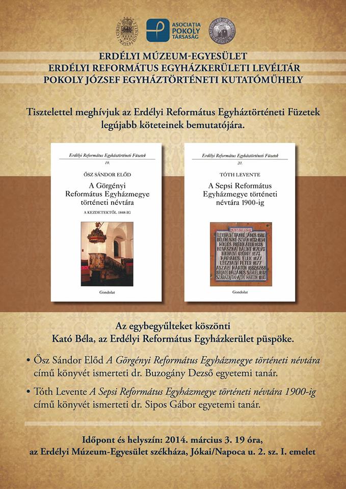 Az Erdélyi Múzeum Egyesület, az Erdélyi Református Egyházkerületi Levéltár és a Pokoly József Egyháztörténeti Kutatóműhely tisztelettel meghívja az Erdélyi Református Egyháztörténeti Füzetek legújabb köteteinek bemutatójára.