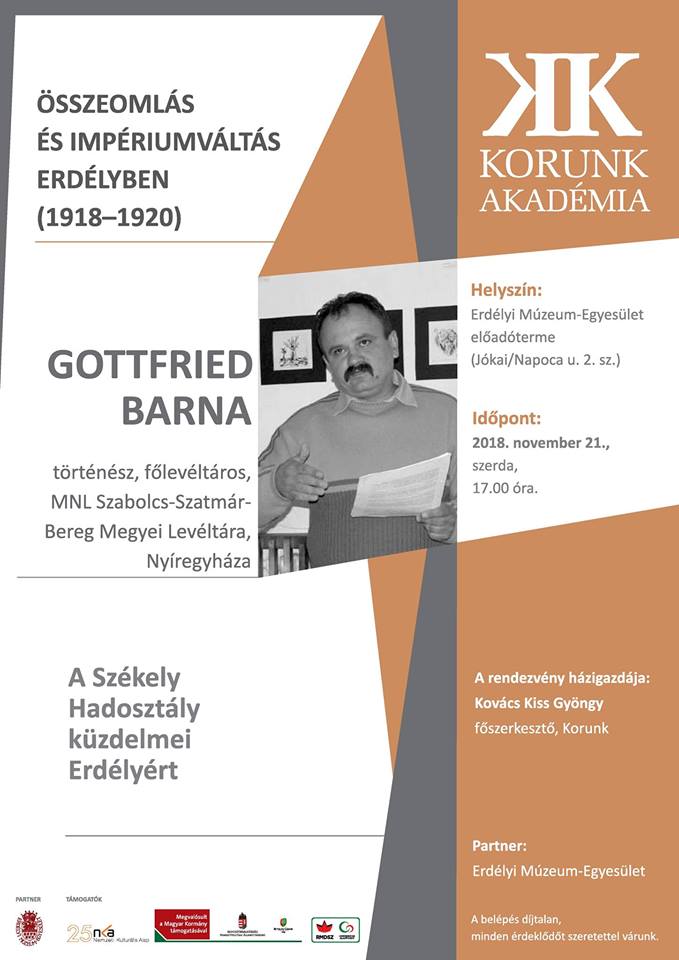 (1918–1920) sorozata novemberi előadásának címe: A Székely Hadosztály küzdelmei Erdélyért. Meghívott előadó: Gottfried Barna, főlevéltáros, MNL Szabolcs-Szatmár-Bereg Megyei Levéltára, Nyíregyháza.