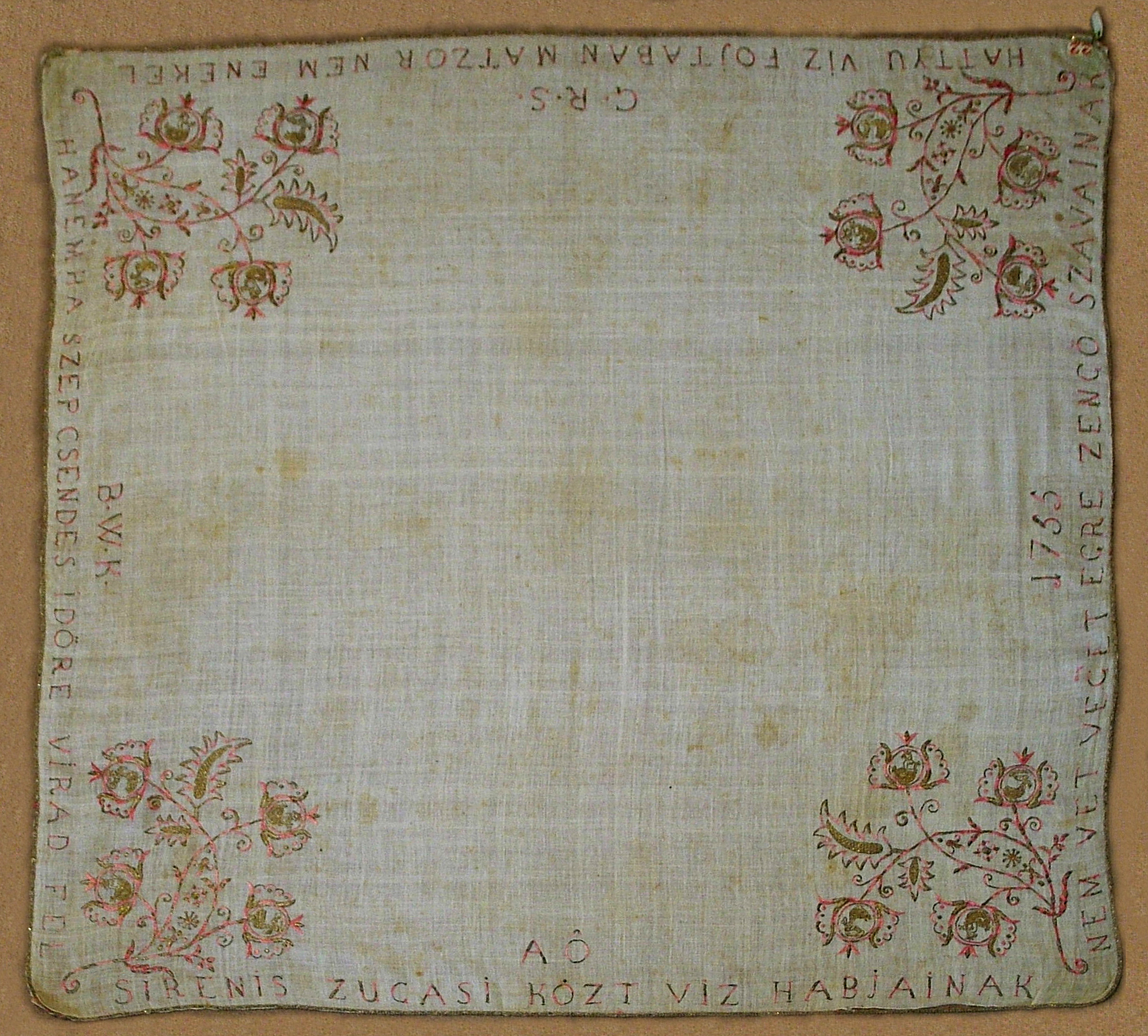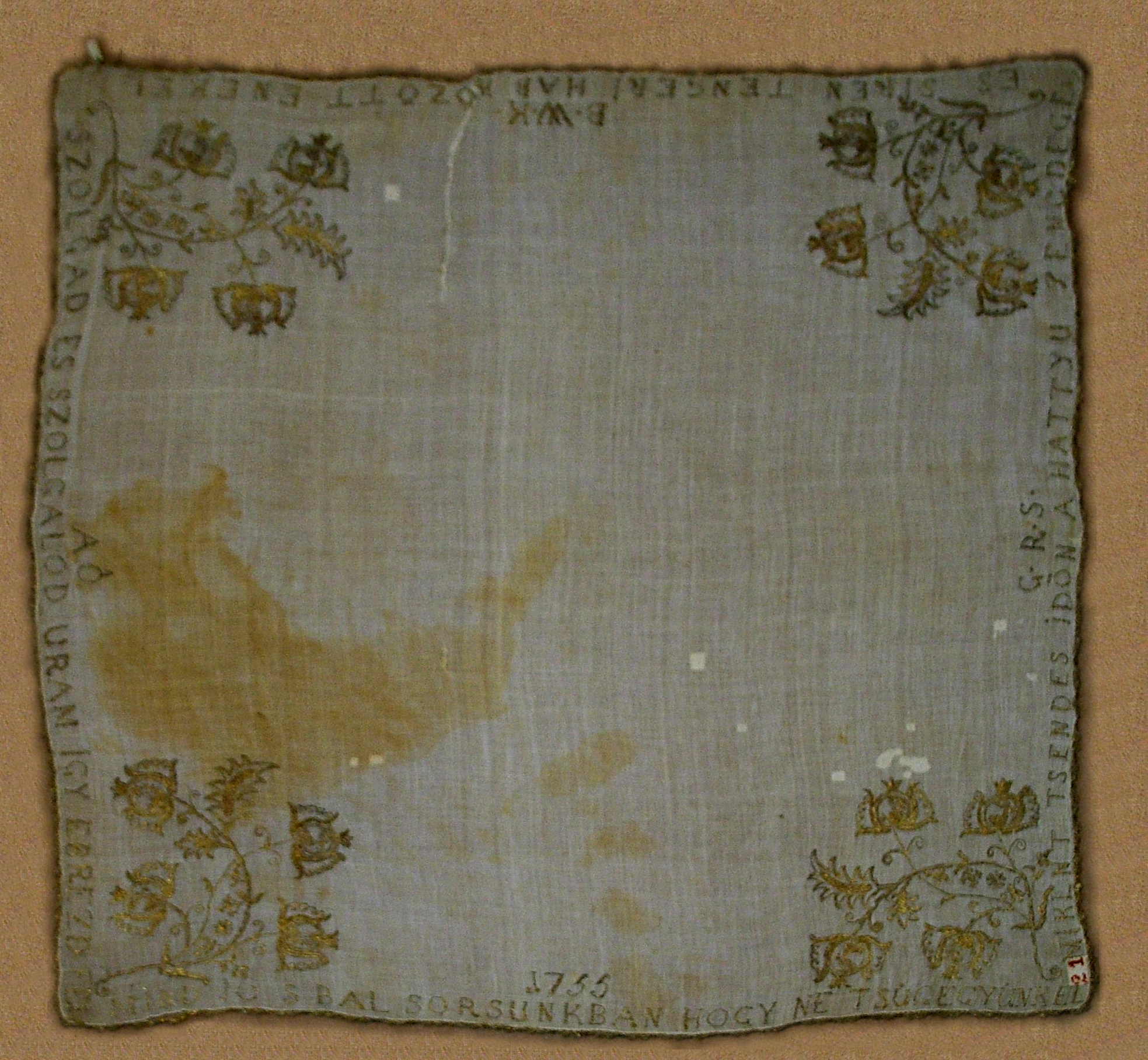 A terítők széleit körbefutó hímzésben egy-egy versszak olvasható, fölöttük pedig a házastársak monogramja és az 1755-ös évszám látható.