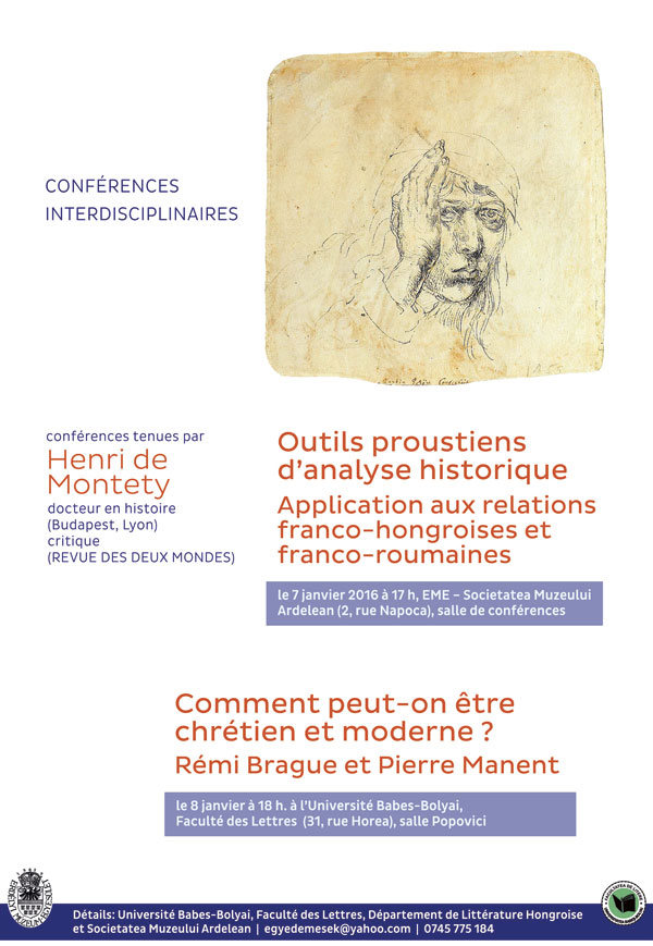 Történelemről másképpen Henri de Montety, a történettudomány doktora (Lyon, Budapest), kritikus (Revue des deux mondes) francia nyelvű előadást tart Outils proustiens d'analyse historique. Application aux relations franco-hongroises et franco-roumaines (Prousti módszerek a történelemértelmezésben. Alkalmazás a francia-magyar és francia-román viszonyokra) címmel 2016. január 7-én 17 órától az Erdélyi Múzeum-Egyesület székházában (Napoca-Jókai u. 2-4. sz., I. emelet).