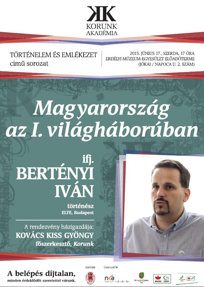 Szeretettel meghívjuk a Korunk Akadémia júniusi rendezvényére, amelynek címe: Magyarország az első világháborúban . Meghívott előadó: ifj. Bertényi Iván történész (ELTE, Budapest).
