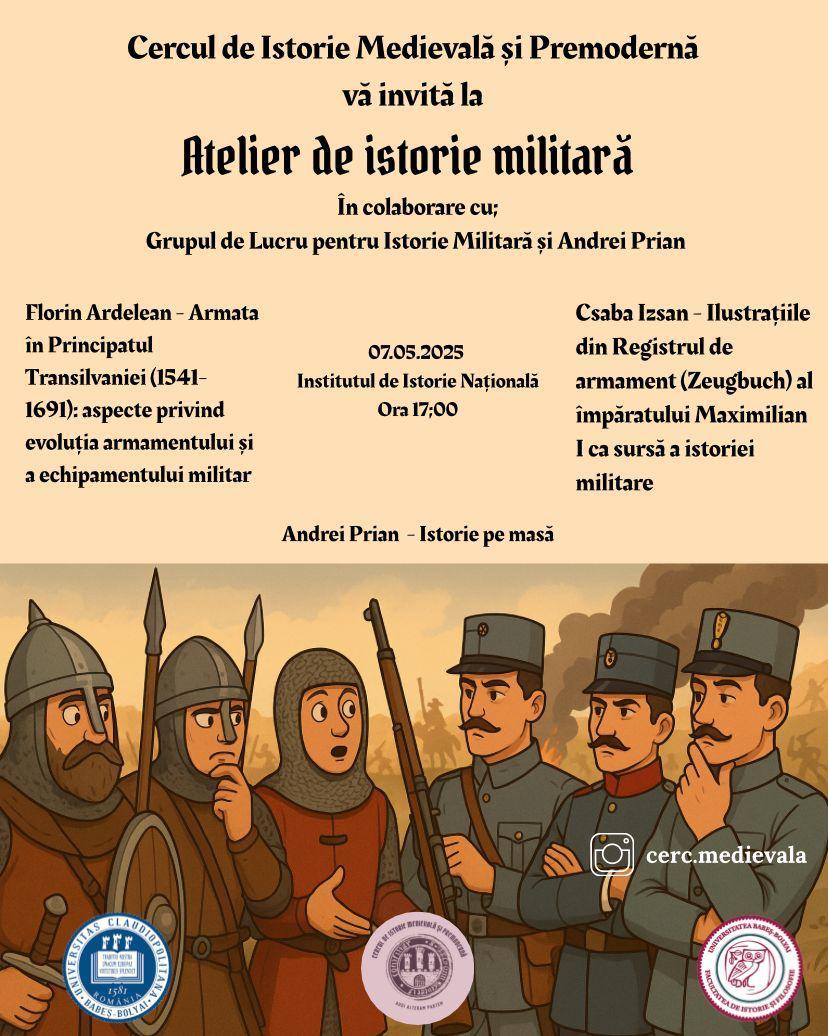 Ugyancsak Izsán Csaba 2025. május 7-én, a BBTE Történelem és Filozófia Karának román tagozatán működő, Középkor és kora újkori történelem kör (Cercul de Istorie Medievală și Premodernă) és a Hadtörténeti kutatócsoport (Grupul de lucru pentru Istorie Militară) szervezésében megrendezett, Hadtörténeti workshopon (Atelier de istorie militară) tartott előadást, Ilustrațiile din Registrul de armament (Zeugbuch) al împăratului Maximilian I ca sursă a istoriei militare (Az I. Miksa császár Fegyverkönyvében szereplő illusztrációk, mint hadtörténeti forrás) címmel tartott előadást. Bemutatójában I. Miksa hadügyi reformjai tükrében tárgyalta az 1502-ben megjelent és Regensburgban részleges formában fennmaradt fegyverkönyv létrejöttének körülményeit, a kiadvány reprezentációs céljait, illetve ábrázolásainak hasznosíthatóságát hadtörténeti forrásként.