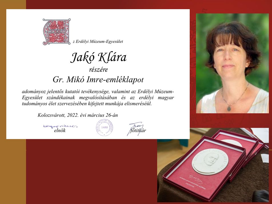 Az Erdélyi Múzeum-Egyesület Jakó Klára részére Gr. Mikó Imre-emléklapot adományozott jelentős kutatói tevékenysége, valamint az Erdélyi Múzeum-Egyesület szándékainak megvalósításában és az erdélyi magyar tudományos élet szervezésében kifejtett munkája elismeréséül.
