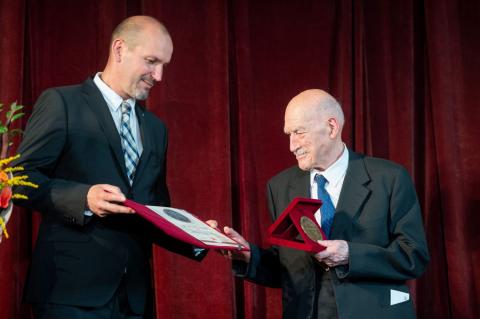 Egyed Ákos egykori EME elnök a magyar történettudomány területén végzett jelentős tevékenységéért, közösség- és tudományszervező munkásságának elismeréséért vehette át az érmet és a díszoklevelet a nyitóünnepség alkalmával.