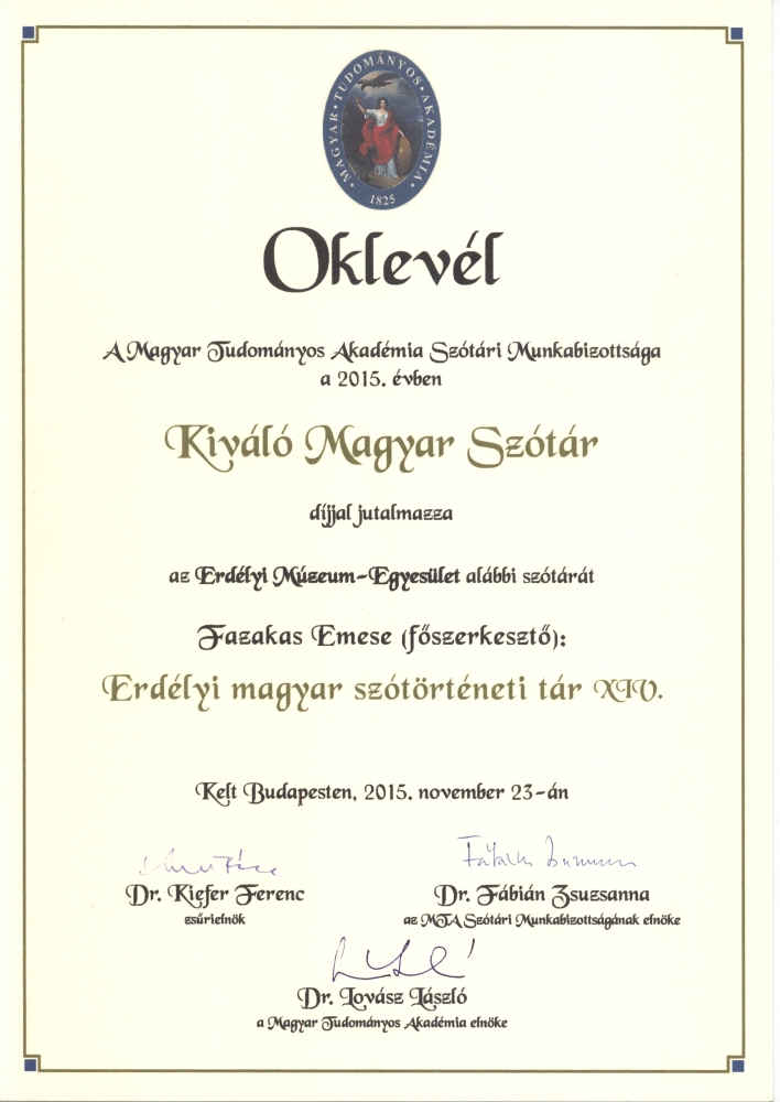 Az Erdélyi magyar szótörténeti tár XIV. kötetét Kiváló szótár díjjal jutalmazta a Magyar Tudományos Akadémia Szótári Munkabizottsága.