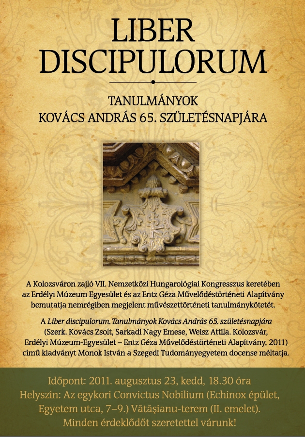 Kedden, augusztus 23-án, a Hungarológiai Kongresszus művészettörténet szekciójának a zárásaképp 18.30-tól kerül sor a Liber discipulorum. Tanulmányok Kovács András 65. születésnapjára. Erdélyi Múzeum-Egyesület , Entz Géza Művelődéstörténeti Alapítvány, Kolozsvár, 2011 című kötet bemutatójára.
