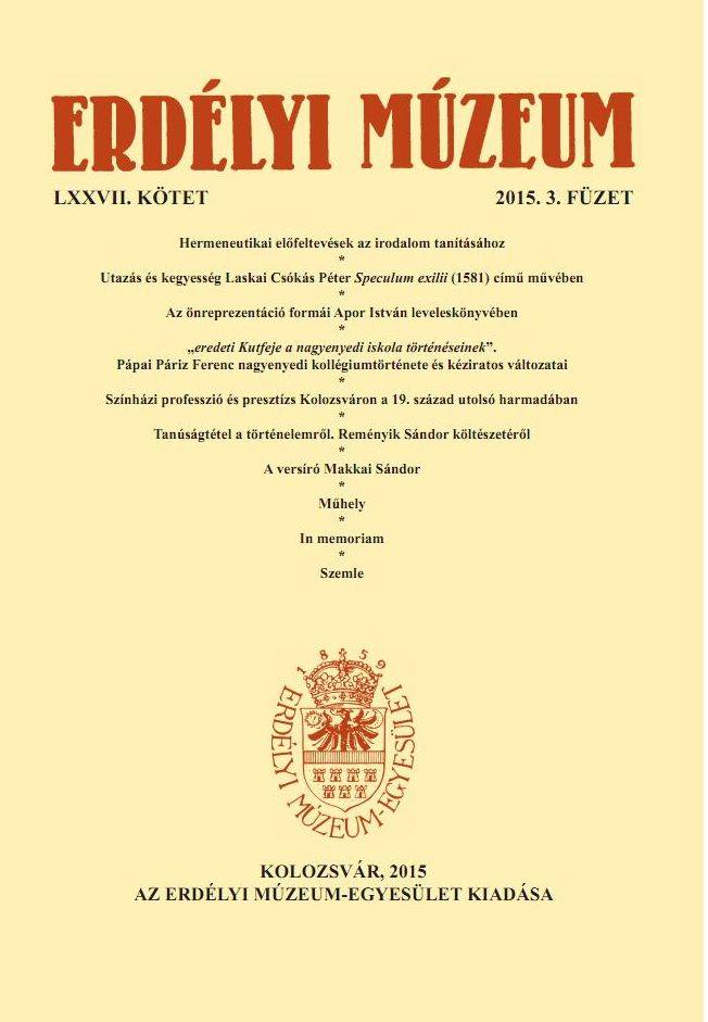 Megjelent az Erdélyi Múzeum 2015/3-as száma, amely irodalom- és a nyelvtudomány-súlypontú. A nyelvtudomány körében a szövegemlékek datálása és egy, az Ómagyar Mária-siralomban előforduló kifejezés értelmezése a tárgya Holló László írásának, Kovács Katalinénak pedig Kápolnásfalu keresztnévanyaga. Hermeneutika és irodalomtanítás összefüggéseiről Szőcs Erzsébettől olvashatunk a folyóiratban. Pápai Páriz Ferencnek az enyedi Református Kollégiumról latinul írott történetét és változatait Rácz Emese mutatja be. A régi magyar irodalom köréből Móré Tünde (Laskai Csókás Péterről), illetőleg Papp Kinga (Apor István leveleiről) közöl tanulmányt. Reményik Sándor költészetét (a Reményik-évforduló kapcsán is) Pomogáts Béla, Makkai Sándorét pedig Végh Balázs Béla helyezi új megvilágításba. Levelekről értekezik Dávid Gyula (Bánffy Miklósnak egy Sziguranca-dossziéban fenmaradt leveleit közre is adja) és Papp Kinga (Apor István önképéről). A hivatásos színészet presztízsét tanulmányozza Bartha Katalin Ágnes (a 19 század végi Kolozsváron), a Prospero könyvsorozatot áttekintése után pedig Zsigmond Andreától szakkönyvek, szövegkiadások ismertetését olvashatjuk, továbbá hasonlókat– a Szemle rovatban – Petruƫ Dávid, Erdős Zoltán, Béres Norbert, Biró Ananmária, Berki Tímea,Oláh Róbert és Gaal György kezével. Bővebben: http://bit.ly/1Xyc9sW