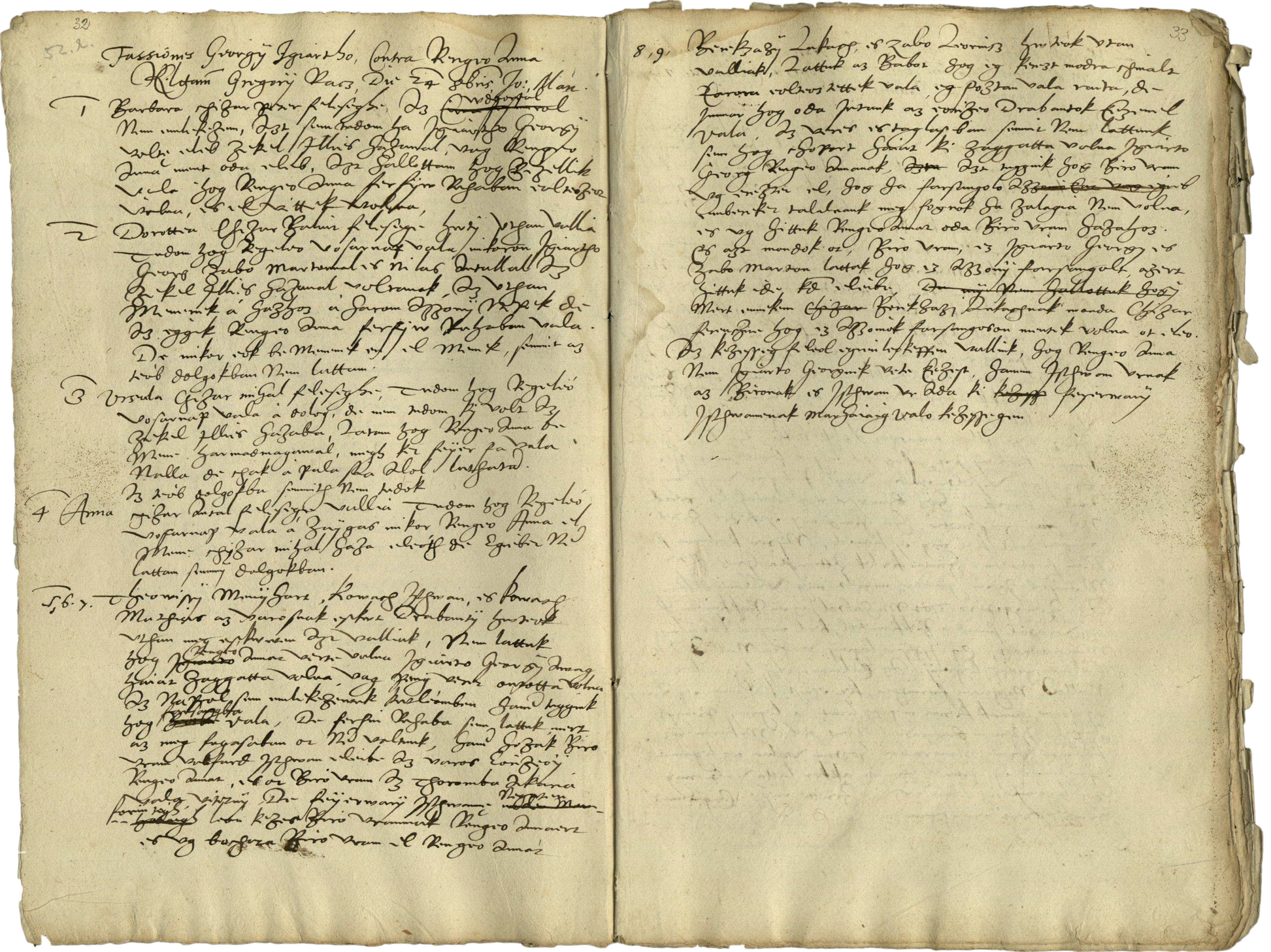 A per két oldala Kolozsvár törvénykezési jegyzőkönyveinek II/3-as kötetéből (32‒33. oldalak)