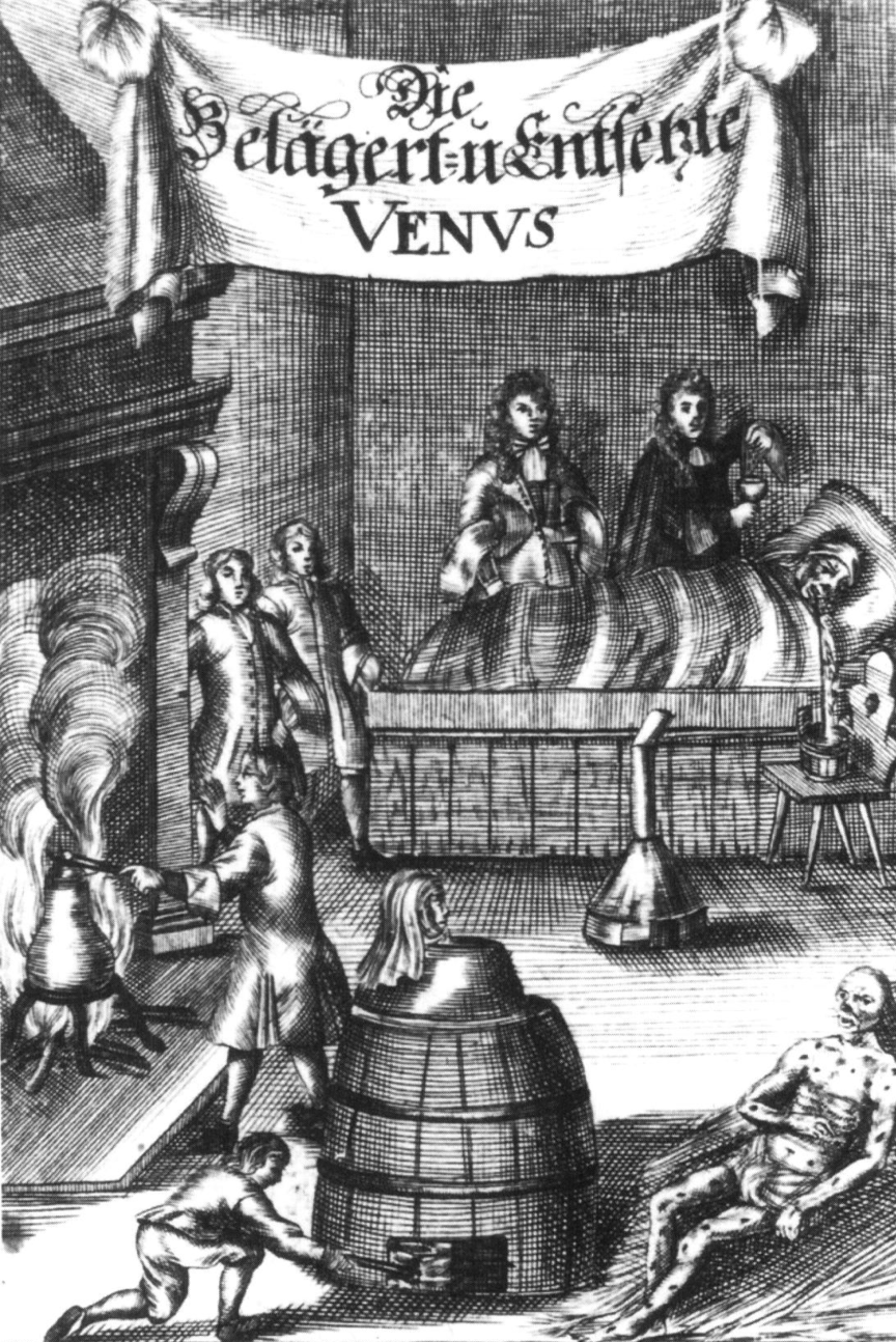 A szifilisz kezelésének módozatai Steven Blankaart: Die belägert- und entsetzte Venus (Augsburg, 1710) című művének egyik ábrázolásán.
