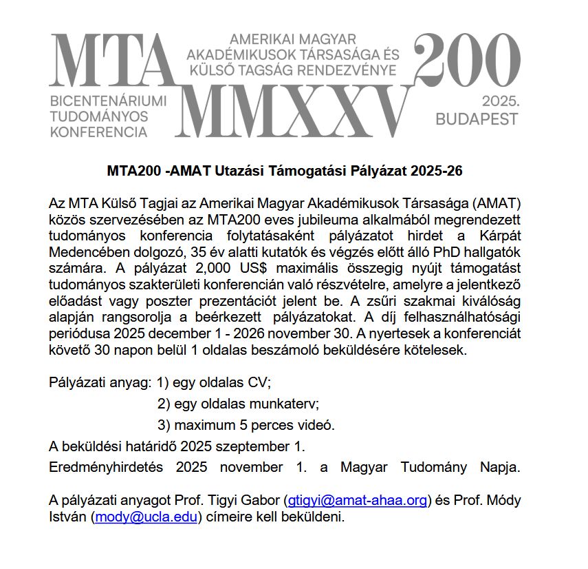Az MTA Külső Tagjai és az Amerikai Magyar Akadémikusok Társasága (AMAT) az MTA alapításának 200. évfordulója alkalmából megrendezett jubileumi konferencia folytatásaként utazási támogatási pályázatot hirdet.