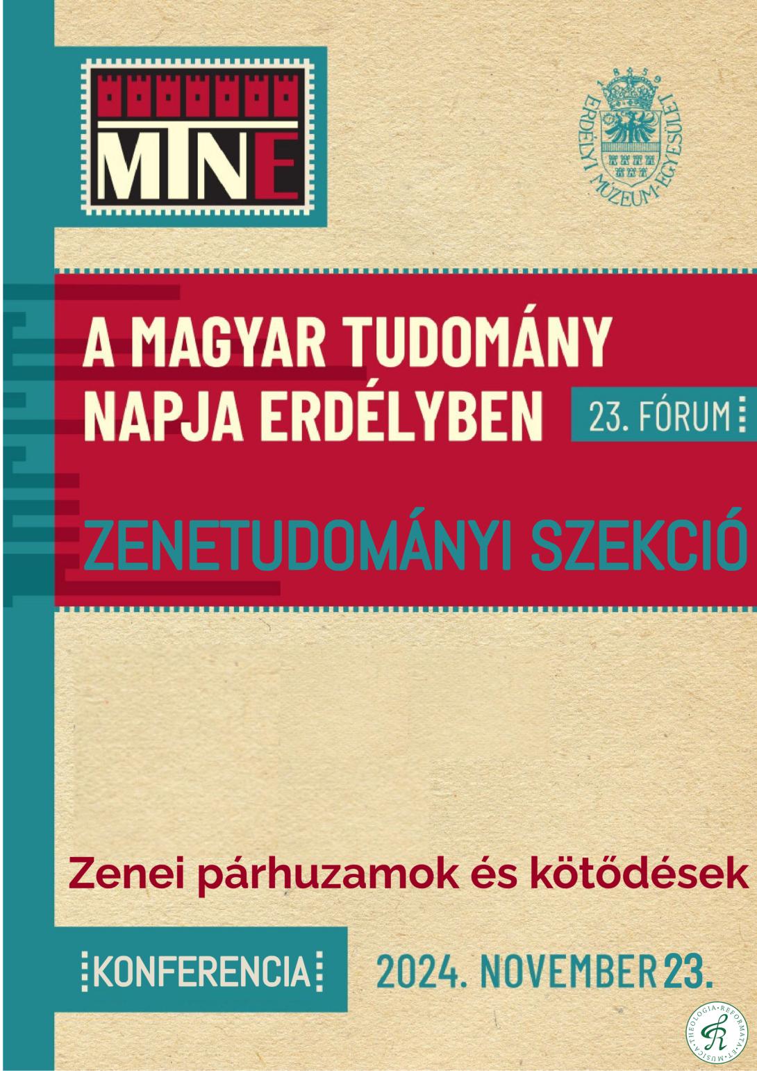 A MTNE 23. fórumán a Zenei párhuzamok és kötődések zenetudományi konferenciára 2024. nov. 23-án, 10.00-14.00 között került sor a társszervező, a kolozsvári BBTE Református Tanárképző és Zeneművészeti Kar székhelyén, az Angi István Teremeben. Kilenc előadó tudományos értekezéssel, két előadó kortárs zenemű megszólaltatásával járult hozzá a rendezvény sikeréhez.