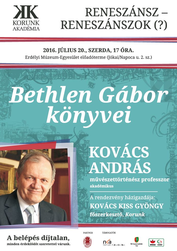 Szeretettel meghívjuk a Korunk Akadémia sorozatzáró rendezvényére, amelynek címe: Bethlen Gábor könyvei. Meghívott előadó: Kovács András művészettörténész professzor, az MTA külső tagja. Az előadásra 2016. július 20-án, szerdán 17 órától kerül sor az Erdélyi Múzeum-Egyesület előadótermében. (Jókai/Napoca u. 2. sz.)