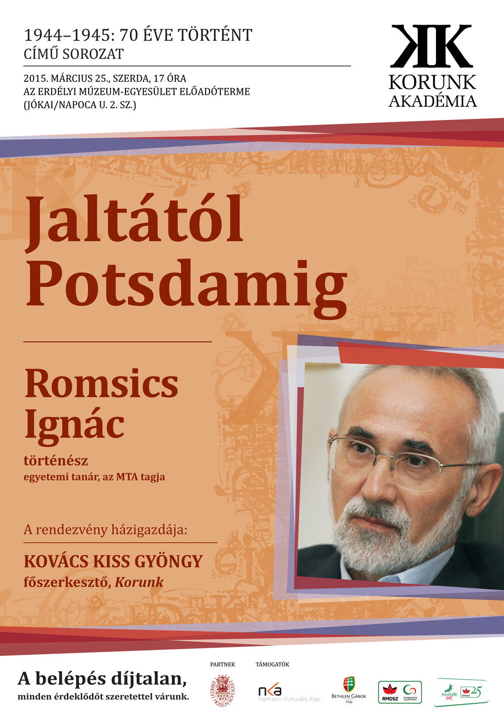 Szeretettel meghívjuk a Korunk Akadémia márciusi rendezvényére, amelynek címe: Jaltától Potsdamig. Meghívott előadó: Romsics Ignác történész (egyetemi tanár, az MTA tagja). Az előadásra 2015. március 25-én, szerdán17 órától kerül sor az Erdélyi Múzeum-Egyesület előadótermében. (Jókai/Napoca u. 2. sz.) A rendezvény házigazdája Kovács Kiss Gyöngy főszerkesztő, Korunk.