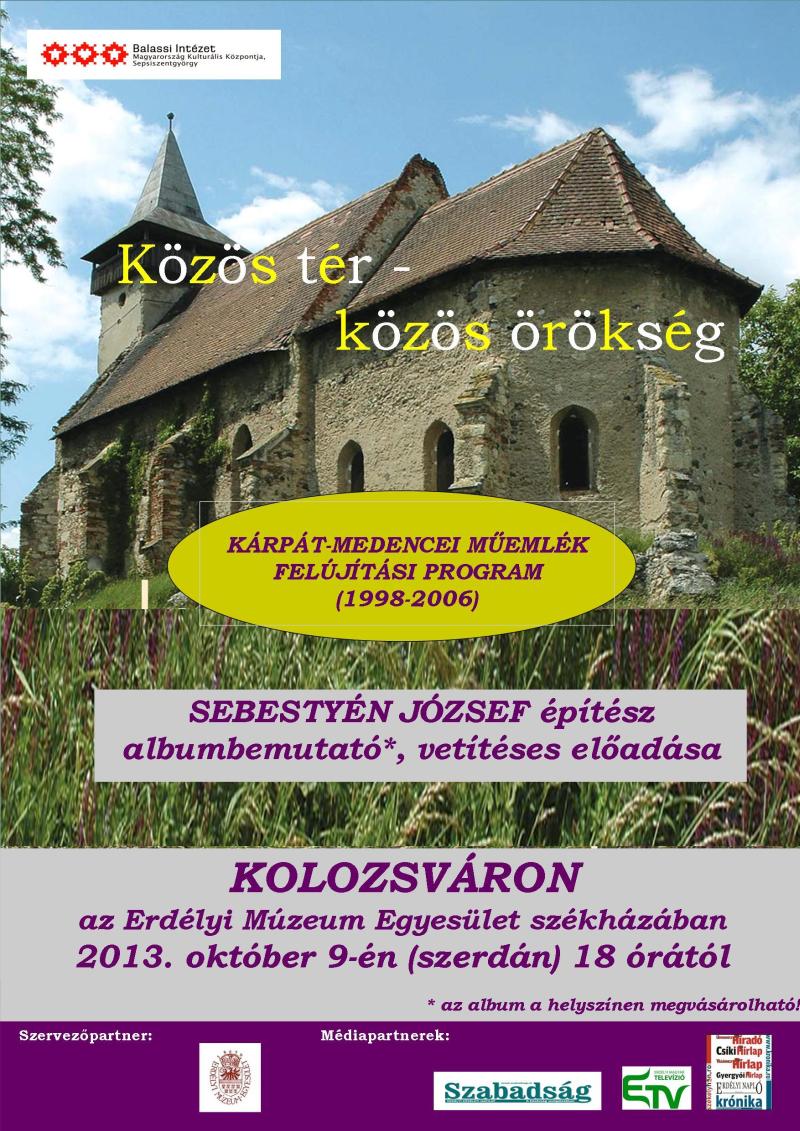 A Balassi Intézet és az Erdélyi Múzeum-Egyesület meghívására 2013. október 9-én, szerdán 18 órától az EME székházban Sebestyén József építész tart albumbemutatót és vetített előadást a Kárpát-medencei műemlék felújítási programról (1998-2006) Közös tér - közös örökség címmel.