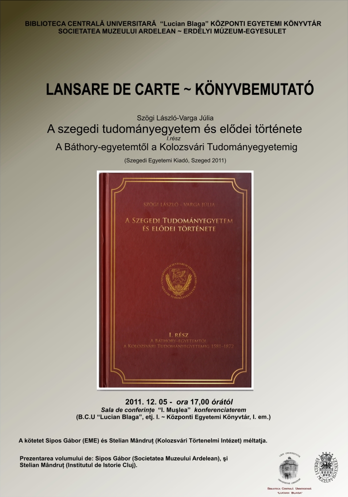 A Kolozsvári Lucian Blaga Központi Egyetemi Könyvtár és az Erdélyi Múzeum–Egyesület tisztelettel meghívja 2011. december 5-én 17,00 órától Szögi László–Varga Júlia: A szegedi tudományegyetem és elődei története I. rész. A Báthory-egyetemtől a Kolozsvári Tudományegyetemig 1581–1872 (Szegedi Egyetemi Kiadó, Szeged 2011) című kötetének bemutatójára, melyre a könyvtár I. Muşlea konferenciatermében kerül sor.