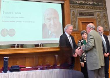Szabó T.E. Attilát, a Veszprémi Egyetem nyugalmazott professzorát, egyesületünk tagját Eötvös József-koszorúval tüntették ki