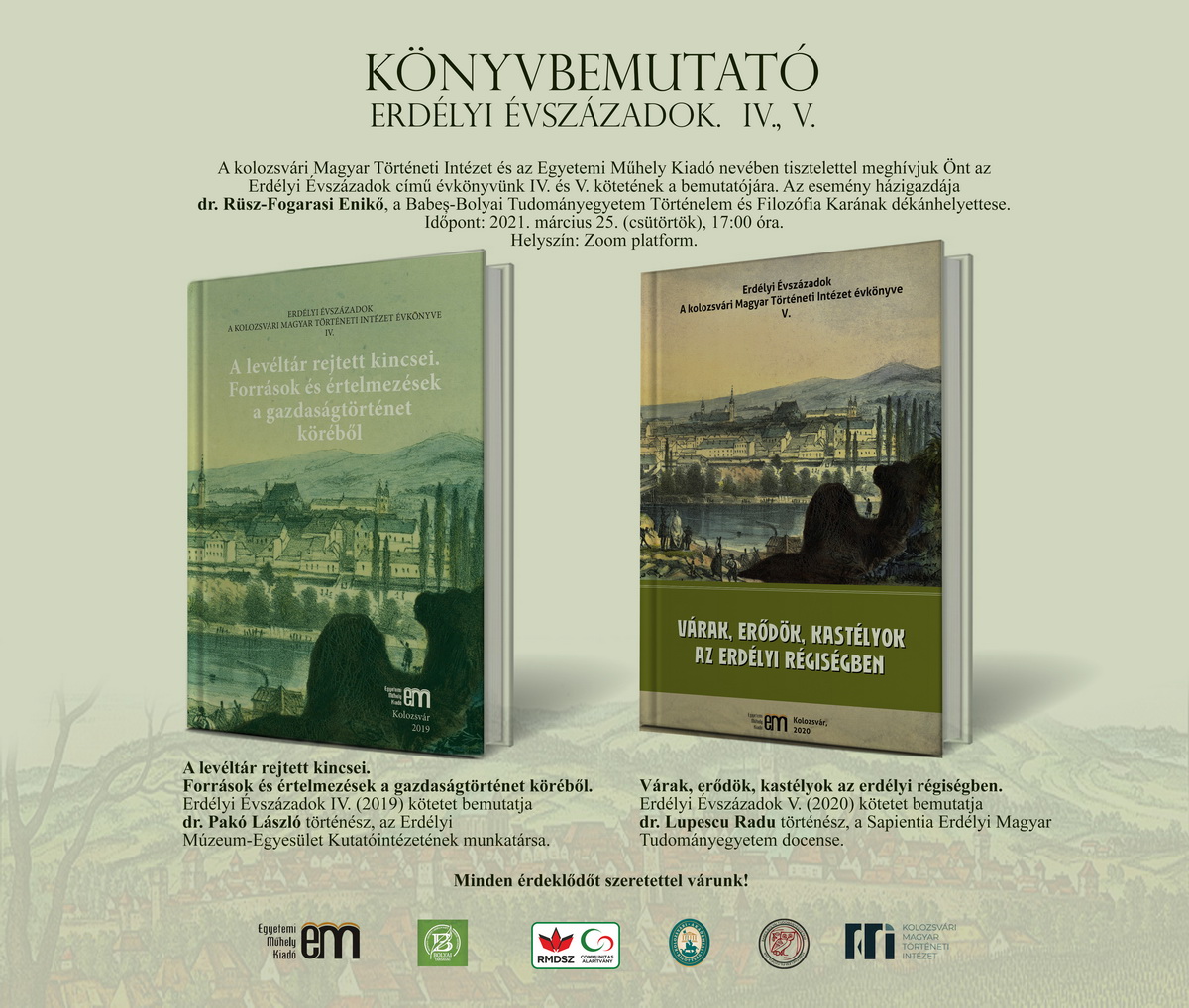2021. március 25-én, d.u. 5 órától a kolozsvári Magyar Történeti Intézet és az Egyetemi Műhely Kiadó szervezésében bemutatják az intézet Erdélyi Évszázadok elnevezésű évkönyvének IV/2019. és V/2020. évi köteteit.