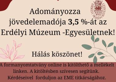 Kérjük támogassa az Erdélyi Múzeum-Egyesületet jövedelemadója 3,5%-ának felajánlásával!