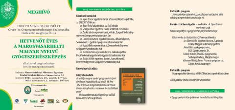 Az Erdélyi Múzeum-Egyesület Orvos- és Gyógyszerésztudományi Szakosztály (EMEOGYSZ) megszervezi a HETVENÖT ÉVES A MAROSVÁSÁRHELYI MAGYAR NYELVŰ GYÓGYSZERÉSZKÉPZÉS kétnapos, ünnepi megemlékezést. A rendezvény A MAGYAR TUDOMÁNY NAPJA ERDÉLYBEN égisze alatt kerül megszervezésre 2023 november 10-11 között, a Marosvásárhelyi Művészeti Egyetem Stúdió Színház termében (Köteles Sámuel utca 6.)