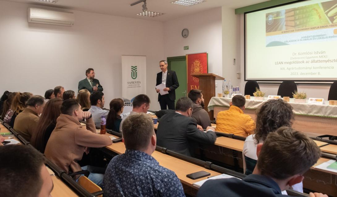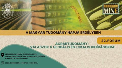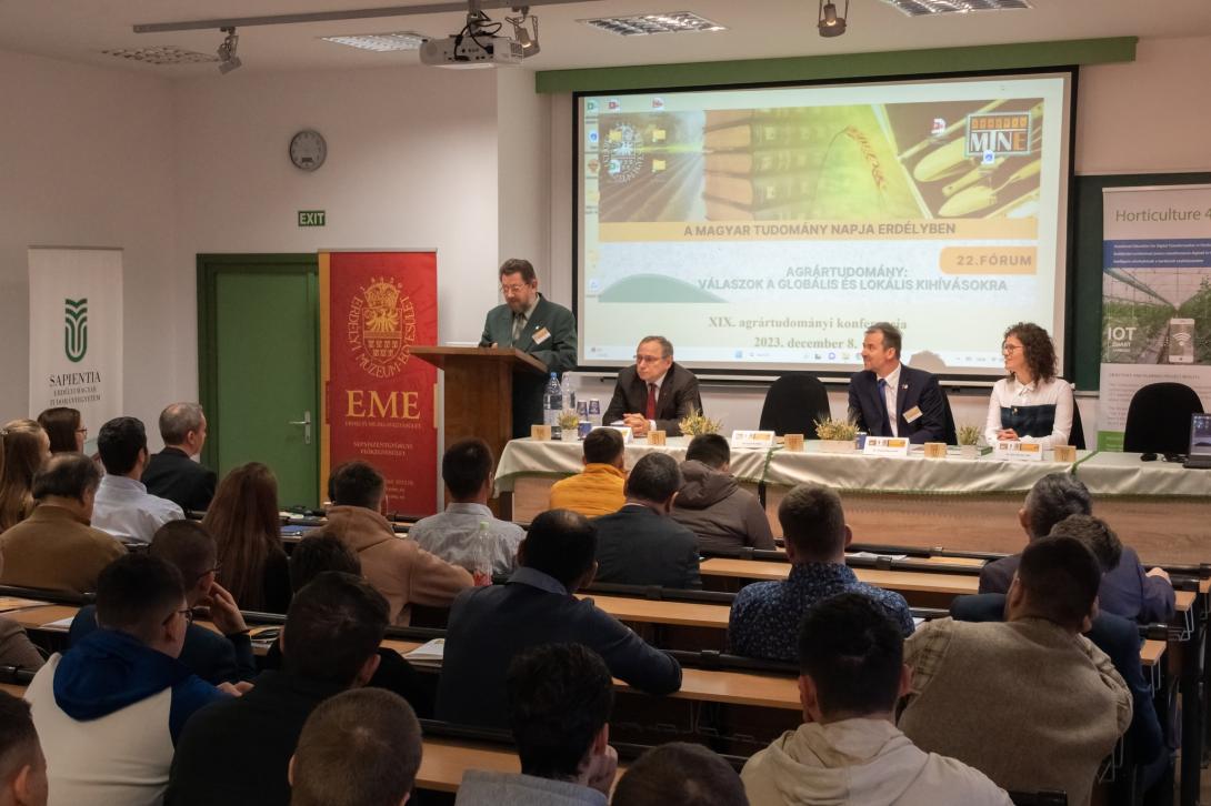 Kapcsolódva a Tudomány: válaszok a globális kihívásokra témájú Magyar Tudomány Napja Erdélyben 2023-as rendezvénysorozathoz az Erdélyi Múzeum-Egyesület Agrártudományi szakosztálya, valamint a Sepsiszentgyörgyi Fiókegyesülete, karöltve a Sapientia EMTE Sepsiszentgyörgyi Karának Élettudományi Tanszékével, valamint a Marosvásárhelyi Karának Kertészmérnöki Tanszékével, továbbá az illyefalvi LAM Alapítvánnyal, 2023. december 8-án megszervezte az Agrártudomány: válaszok a globális és lokális kihívásokra témájú XIX. Agrártudományi Konferenciát. A rendezvény helyszíne: a Sapientia EMTE Sepsiszentgyörgyi Kara volt. A konferencia alatt néhány előadás részletét élő adásban közvetítettük az Erdélyi Múzeum Egyesület facebook oldalán, valamint a Sapientia Sepsiszentgyörgyi facebook oldalán, hogy a virtuális nagyközönség számára is betekintési lehetőséget nyújtsunk tudománynépszerűsítés céljából.