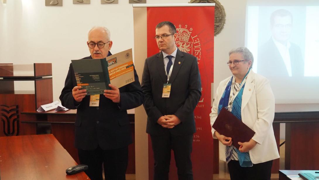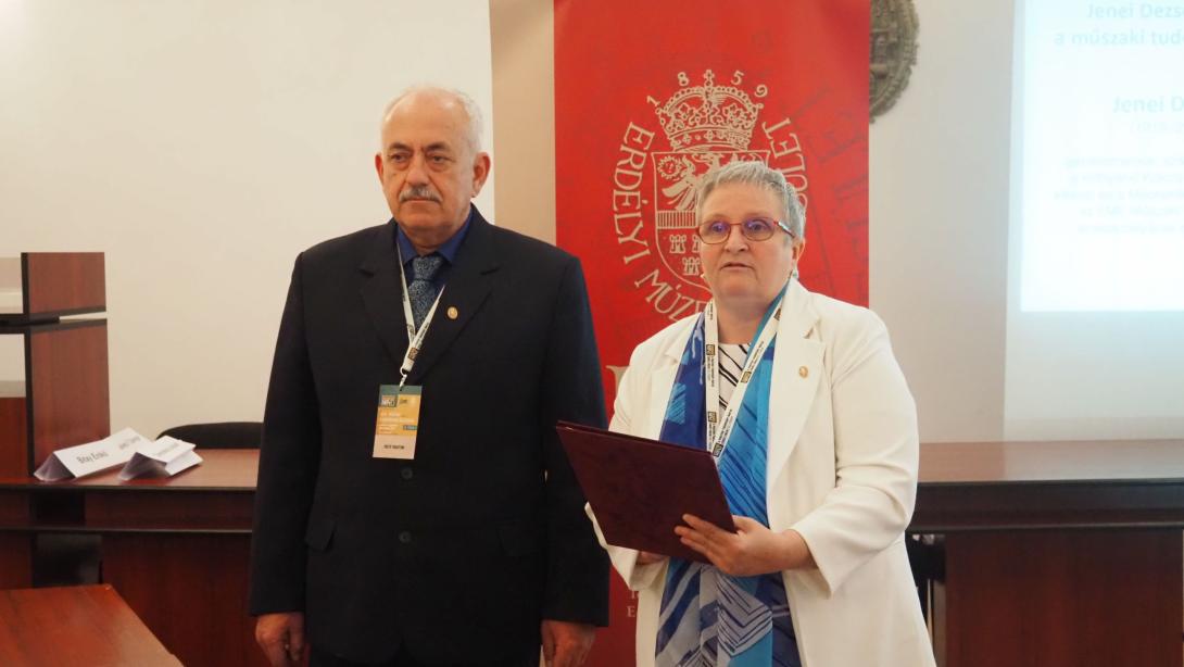 Rendezvényünk egyik lényeges mozzanata, melynek már többéves hagyománya van, a Jenei Dezső-emléklap átadása (https://www.eme.ro/web/guest/jenei-dezso-emleklap), amely ünnepélyes keretet biztosít az erdélyi magyar műszaki tudományosságért kifejtett tevékenység elismerésére. Az idei kitüntetettünk dr. Forgó Zoltán gépészmérnök, egyetemi docens, a Sapientia Erdélyi Magyar Tudományegyetem, Marosvásárhelyi Kar, Gépészmérnöki Tanszék vezetője. A díjazottat dr Máté Márton, az EME Műszaki Tudományok Szakosztályának alelnöke laudálta.