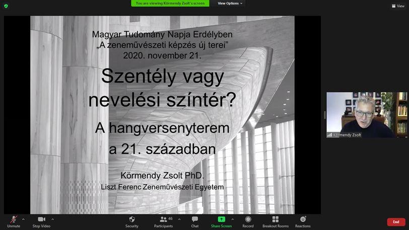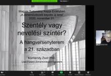 3. A Zenetudományi szekció keretében idén A zeneművészeti képzés új terei címmel szervezett online konferenciát az I. szakosztály keretében működő Erdélyi Zenetudományi Munkaközösség és a BBTE Református Tanárképző és Zeneművészeti Kara november 21-én. A rendezvényen 11 meghívott előadó (erdélyi és magyarországi egyetemi és középiskolai oktató, egyházzenész) tartott tíz előadást. A rendezvény keretében Angi István professzor úrra emlékeztek a résztvevők, az elismert zeneesztéta megalapítása (2005) és újjászervezése (2018) óta az Erdélyi Zenetudományi Munkaközösség minden tevékenységét támogatta jelenlétével és publikációival. Az iskolatörténeti és oktatástörténeti előadások után, első ízben Erdélyben, zenei mediációhoz, koncertpedagógiához kapcsolódó kutatási eredményeket és adatokat ismertettek az előadók. A kérdésekben, hozzászólásokban is gazdag, jó hangulatú konferenciát két kötet bemutatója zárta. Az előadókon és a szervezőkön kívül a BBTE Zeneművészeti és Pedagógia és Alkalmazott Didaktika Karának oktatói és diákjai, középiskolai zenetanárok, rádiós szakemberek és tanítók vettek részt a rendezvényen. A konferencia kivonatfüzete letölthető innen (pdf formátumban)