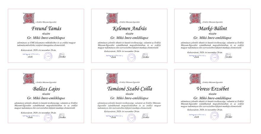 2020-ban az Erdélyi Múzeum-Egyesület Mikó Imre-emléklappal tüntette ki Freund Tamás akadémikust, a Magyar Tudományos Akadémia elnökét az EME folyamatos működéséhez és az erdélyi magyar tudományműveléshez nyújtott támogatása elismeréséül. Gr. Mikó Imre-emléklappal tüntette ki az EME Kelemen András villamosmérnököt, a Sapientia EMTE Marosvásárhelyi Kar dékánját, Markó Bálintot, a BBTE rektorhelyettesét, Balázs Lajos néprajzkutatót, egyetemi docenst, Tamásné Szabó Csilla tudományos kutatót valamint Veress Erzsébet vegyészt.