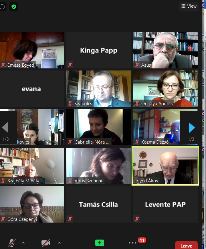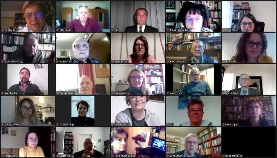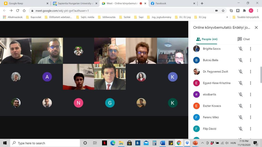 7. A jogtudományi szekció második rendezvényére szintén a Sapientia EMTE Jogtudományi Intézetével közös szervezésben került sor november 19-én, online könyvbemutató formájában Erdélyi jogászok. Jogászportrék 1. címmel. A rendezvényen a háromkötetesre tervezett Erdélyi jogászok könyvsorozat nyitó darabját mutatták be (a mű 15 erdélyi kötődésű jogtudósok, gyakorló jogászok életútját és pályaképét mutatja be a 19. századtól napjainkig esszészerű szövegekben). A bemutatón 6 szerző vett részt, akik az általuk jegyzett portrékat mutatták be, ezt követően pedig kérdéseket lehetett feltenni, amellyel a résztvevők közül többen éltek. Az online formátumnak köszönhetően ezen a rendezvényen is romániai és magyarországi érdeklődők egyaránt részt vettek (a nézők száma átlagosan 48-ra tehető). A bemutatóról szóló részletesebb szöveg itt tekinthető meg: http://jog.sapientia.ro/hu/konferenciak-rendezvenyek/online-konyvbemutato-erdelyi-jogaszok-jogaszportrek-1