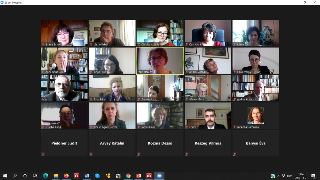 1. A Nyelv-, irodalom-, néprajz- és színháztudományi szekció A szokatlanság kihívásai címmel szervezett online konferenciája a nyelvészet, irodalom-, színház- néprajztudomány és filmművészet szakembereit gyűjtötte össze a virtuális térben (Zoom-platformon) november 21-én. Az előadások, könyv- és lapbemutatók és megbeszélések dinamikus egymásutánja a szakmai nyilvánosságnak e formájában tette a kutatások eredményeit ellenőrizhetővé, hozta az érintetteket egymással szakmai dialógusba. A nyelvészet (helynévkutatás, irodalmi fordítás); a szövegkritika (beleértve a latin nyelvű forrásvizsgálatot és a prédikációkutatást); a történettudomány; a színházi-bábszínházi és filmesztétika (és szcenika), a sajtótörténet témakörében elhangzó előadások között megtartott lap- és könyvbemutatók által nemcsak az érdeklődés fenntartása, hanem jelentős mennyiségű tudományos probléma tematizálása, új információk közlése vált lehetővé.