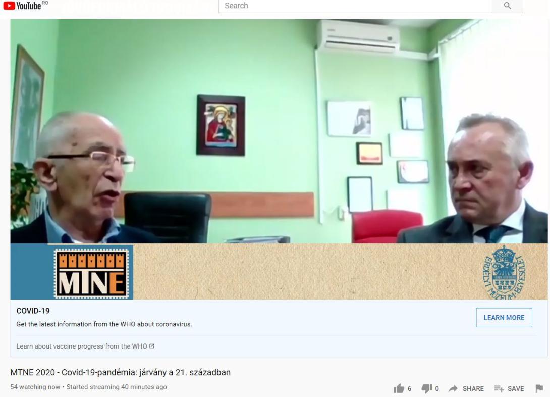 5. Az ORVOS- ÉS GYÓGYSZERÉSZTUDOMÁNYI SZAKOSZTÁLY kolozsvári fiókjának szervezésében online kerekasztal beszélgetésre került sor november 21-én, melynek címe Covid-19 pandémia: járvány a 21. században. A virtuális térben zajló beszélgetésen a betegség ismert jellegzetességeit és főbb járványtani sajátosságait tekintették át. A kerekasztal jellegű, interaktív beszélgetésen dr. Bódizs György, a Covid kórházzá átalakított kolozsvári Rehabilitációs korház orvosigazgatója és dr. Molnár B. Géza, epidemiológus főorvos osztották meg tapasztalataikat nemcsak a kollégákkal hanem az érdeklődőkkel is, akik bekapcsolódhattak és aktívan is részt vehettek a beszélgetésben. A rendezvény itt tekinthető meg: https://youtu.be/uKk7jKSGLLs