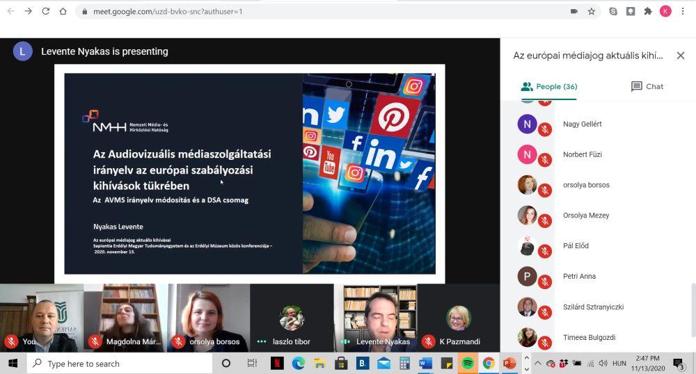 6. A IV., Jog-, Közgazdaság- és Társadalomtudományi szakosztály Jogász szekciója, illetve a Sapientia EMTE Jogtudományi Intézete 2020-ban is közösen szervezte meg A Magyar Tudomány Napja Erdélyben c. rendezvénysorozat jogtudományi szekciójának programját. Idén két szakosztályi rendezvényre került sor online formában. November 13-án Az európai médiajog aktuális kihívásai címmel szerveztek médiajogi konferenciát, ahol 3 tematikus blokkban összesen 9 szakember adott elő (3 magyarországi és 6 romániai), köztük gyakorló jogászok, egyetemi oktatók és médiaszakemberek is. Az online formátumnak köszönhetően a közönség soraiba, a romániai publikum mellett, szép számban kapcsolódtak be Magyarországról is (a nézők száma átlagosan 43-ra tehető). A rendezvény visszhangja nagyon pozitív volt, egy esetleges folytatás gondolata is felmerült. A Kolozsvári Rádió szerkesztett formában utólag újraközvetítette a rendezvény egy részét valamint a Bukaresti rádió