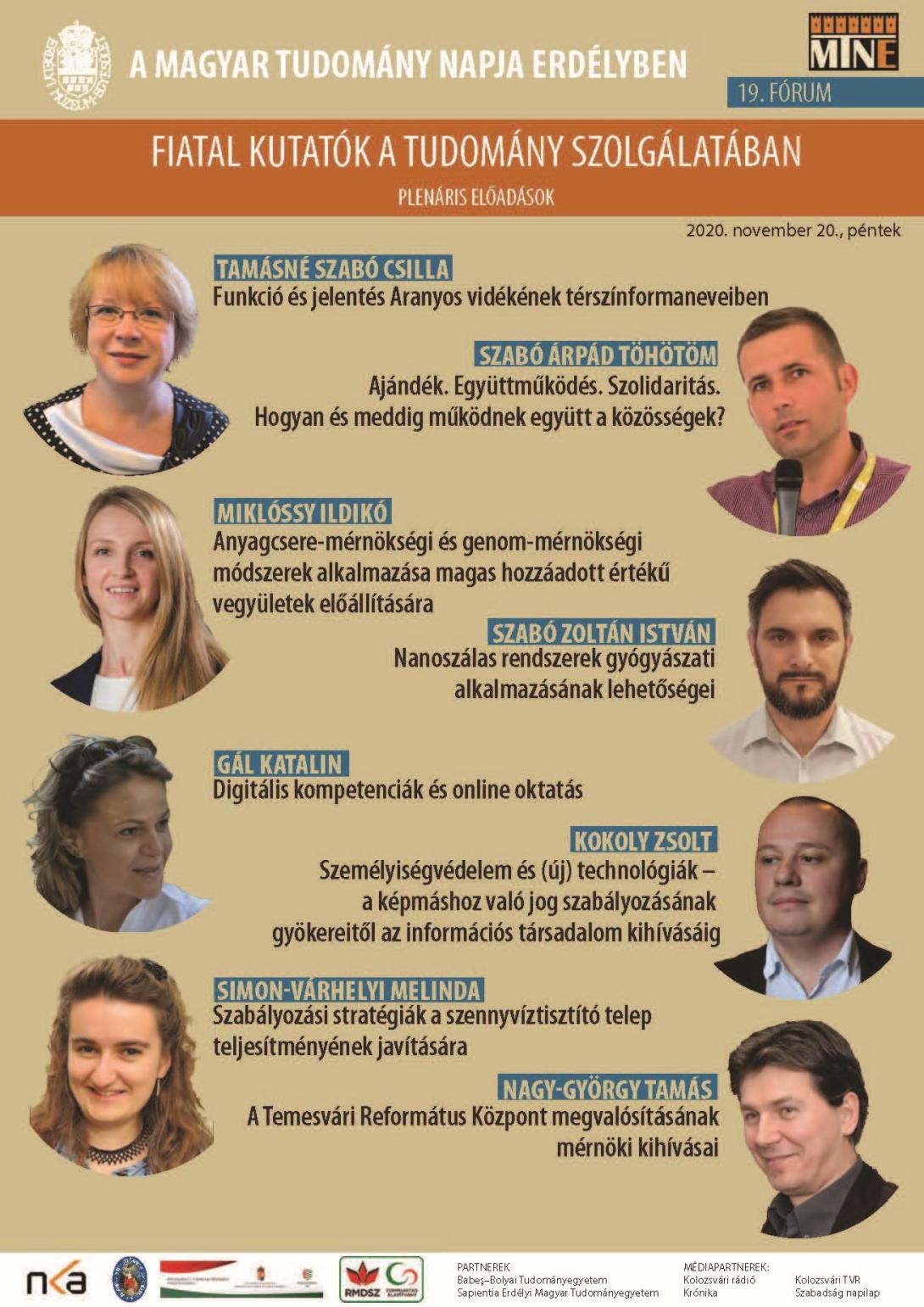 2020-ban A Magyar Tudomány Napja Erdélyben című konferencia nyitóünnepségét és plenáris előadásait november 20-án, pénteken tartottuk videókonferencia formájában. Az utóbbi években a fórum témájának megválasztásában is az MTA ajánlását követtük, így a 19. rendezvényünk témája Jövőformáló tudomány volt.