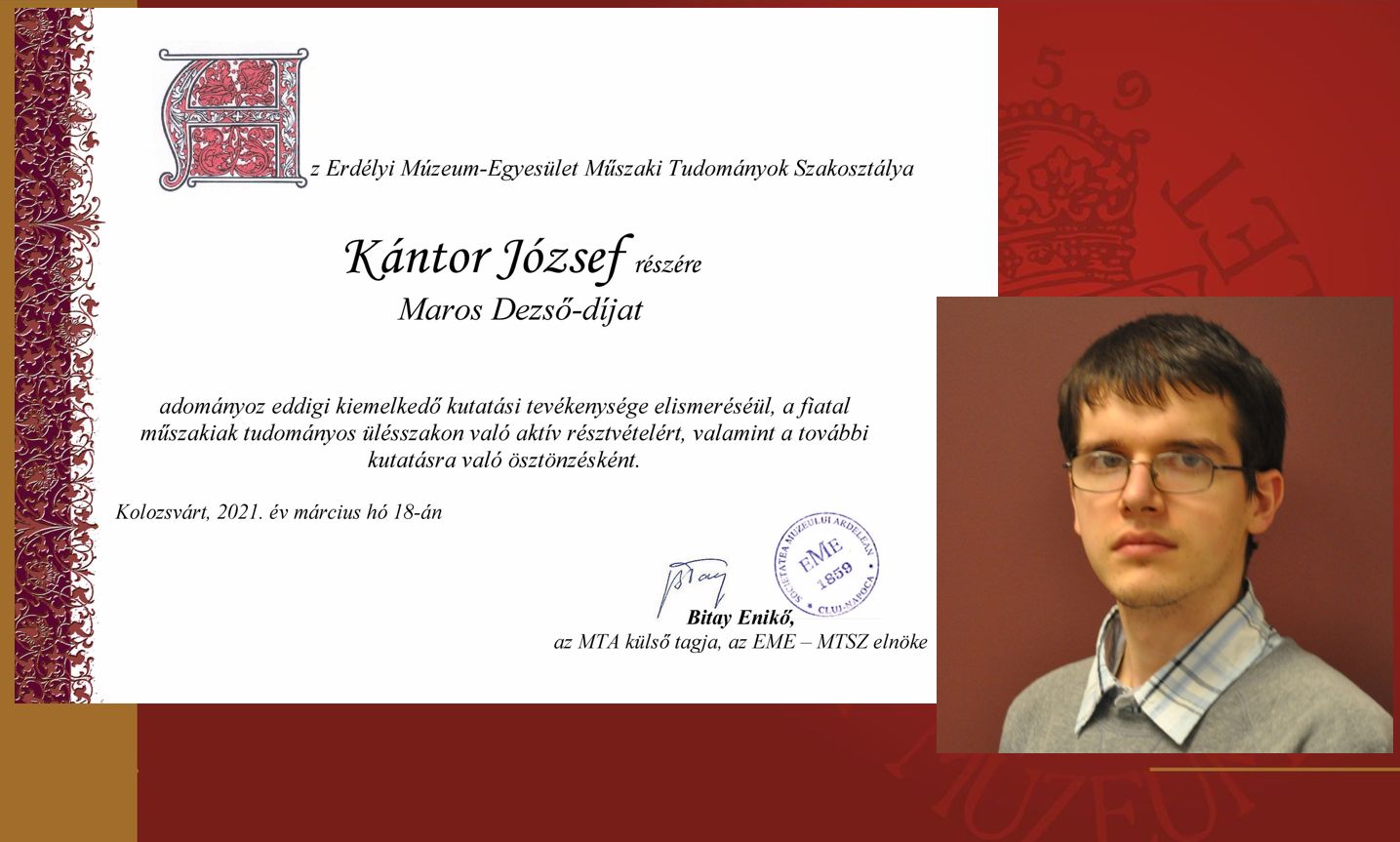 A fiatal, 35 év alatti kutatóknak járó Maros Dezső-díjat ebben az évben Kántor József mérnök, egyetemi adjunktus kapta.
