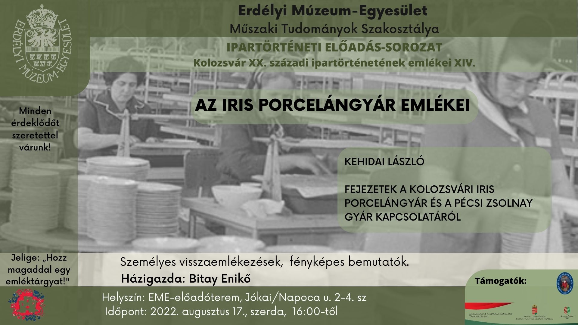 Augusztus 17-én, szerdán 16 órától kerül sor az EME Jókai/Napoca utcai székházában arra a beszélgetéssel egybekötött találkozóra, amelyet az Iris porcelángyár emlékeinek felidézésére szerveznek. A gyár történetéről egykori alkalmazottakat szólítanak meg, a kolozsvári Iris porcelángyár és a pécsi Zsolnay gyár kapcsolatáról pedig Kehidai László tart előadást. A fórum házigazdája Bitay Enikő.