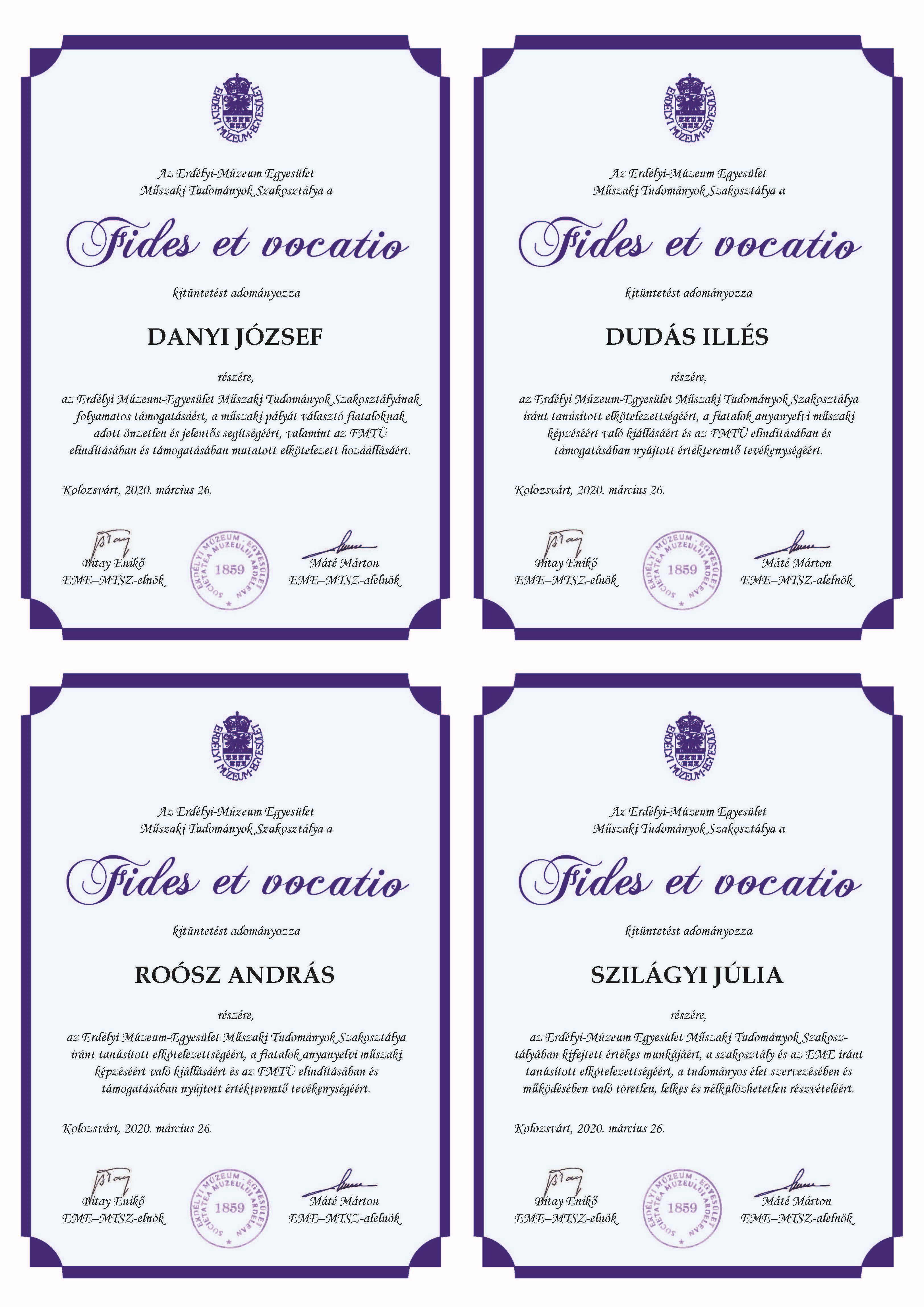 Az Erdélyi Múzeum-Egyesület Műszaki Tudományok Szakosztálya Fides et vocatio kitüntetésben részesítette Danyi Józsefet, Dudás Illést, Roósz Andrást az Erdélyi Múzeum-Egyesület Műszaki Tudományok Szakosztályának folyamatos támogatásáért, a műszaki pályát választó fiataloknak adott önzetlen és jelentős segítségéért, valamint az FMTÜ elindításában és támogatásában mutatott elkötelezett hozáállásáért és Szilágyi Júliát az Erdélyi-Múzeum Egyesület Műszaki Tudományok Szakosztályában kifejtett értékes munkájáért, a szakosztály és az EME iránt tanúsított elkötelezettségéért, a tudományos élet szervezésében és működésében való töretlen, lelkes és nélkülözhetetlen részvételéért.