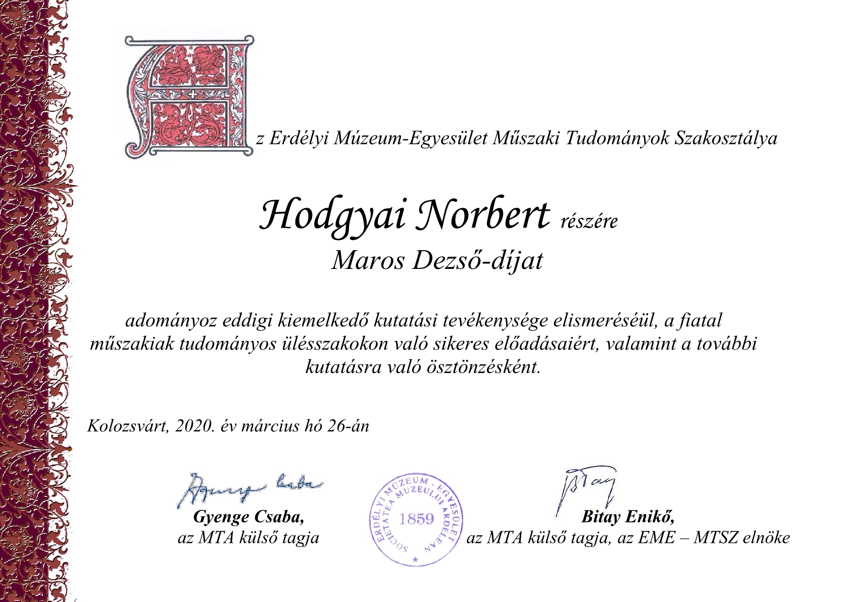 Az Erdélyi Múzeum-Egyesület Műszaki Tudományok Szakosztálya Hodgyai Norbert részére Maros Dezső-díjat adományozott eddigi kiemelkedő kutatási tevékenysége elismeréséül, a fiatal műszakiak tudományos ülésszakokon való sikeres előadásaiért, valamint a további kutatásra való ösztönzésként. A kitüntetést Bitay Enikő, az EME főtitkára, a Műszaki Tudományok Szakosztályának elnöke és Máté Márton a Műszaki Tudományok Szakosztályának alelnöke nyújtotta át virtuálisan a 25. FMTÜ Jubileumi videokonferencián 2020. március 26-án. Ajánlás - laudáció