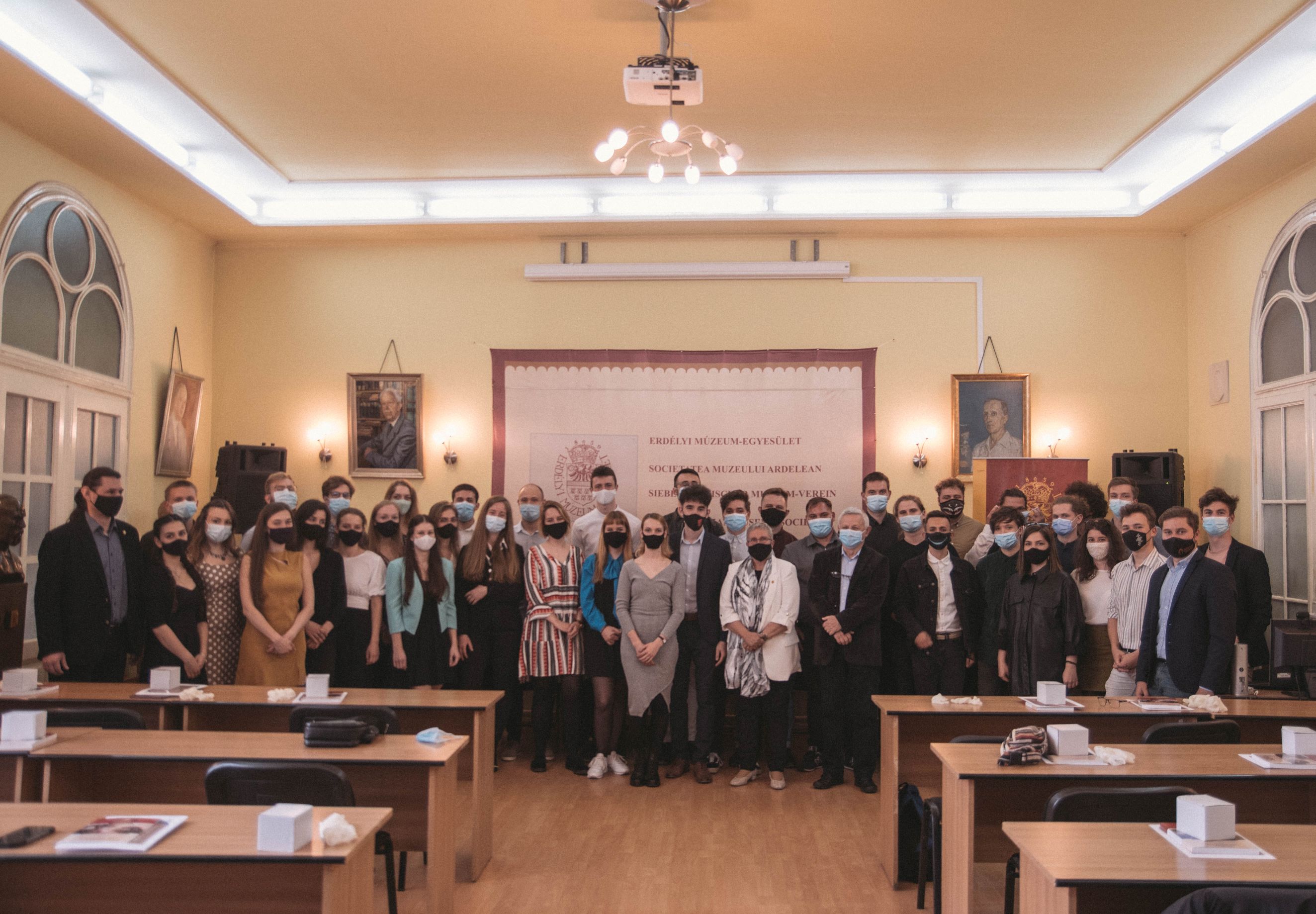 Maszkos ballagó diákok az EME előadótermében, Kolozsvárt 2021. június 1-én