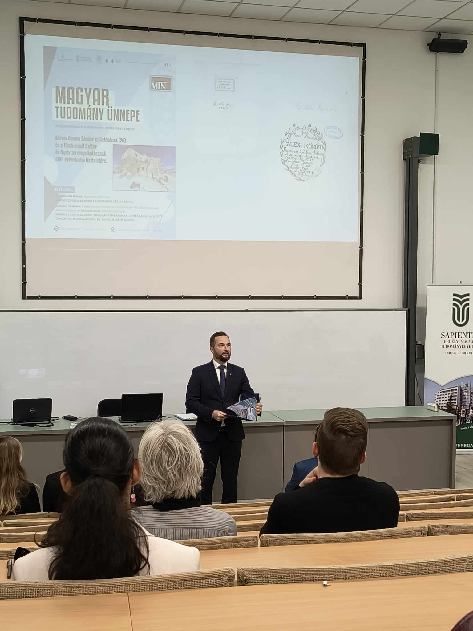 | [node:body] | Csíkszeredában 2024. november 7-én, 18 órától került megrendezésre a Magyar Tudomány Napja Erdélyben 23 fórumának keretén belül, Kőrösi Csoma Sándor születésének 240. és a Tibeti Nyelvtan születésének 200. születésnapja alkalmából szervezett emlékülésre. Az előadók: Dr. Oláh-Gál Róbert, Benedek Szabolcs és Burista Emese voltak. A rendezvény helyszíne a Sapientia EMTE, Csíkszeredai Karának nagyaulája volt. Az eseményen több mint 50 résztvevő vett részt, egyetemi hallgatók, oktatók és Kőrösi Csoma Sándor élete után érdeklődők. Az ünnepi emlékülést Dr. Pap Levente megbízott dékán nyitotta meg, majd Perce László konzul köszöntötte a résztvevőket, Magyarország Csíkszeredai Főkonzulátus részéről. Oláh-Gál Róbert, a Csíkszeredai Fiókegyesület elnöke röviden köszöntötte a megjelenteket és megtartotta 20 perces előadását: Kőrösi Csoma Sándor legkorábbi, diákkori kéziratáról, röviden ismertette a tartalmát. Felvázolta Kőrösi Csoma Sándor nagyenyedi diákéveinek jelentőségét és főleg kiváló tanárait, Herepei Ádámot, II. Kováts Józsefet, Nemegyei Jánost, akik Bolyai Farkasnak is tanárai voltak. Következőnek Burista Emese építészgyakornok és Benedek Szabolcs mérnökmenedzser szakos hallgató, beszámoltak az idei indiai Zanglában végzett önkéntes munkájukról, kiemelve Kőrösi Csoma Sándor emberfeletti erőfeszítéseit, a tibeti nyelvtan és szótár megalkotásáért. Vetítéssel gazdagon illusztrálták a beszámolójukat. Rendezvényünk sajtóvisszhangja: Az előadókkal rövid interjút készített a Kossuth Rádió Határok Nélkül című műsora. A Hargita Népe Sapi Népe rovata is interjút készített |