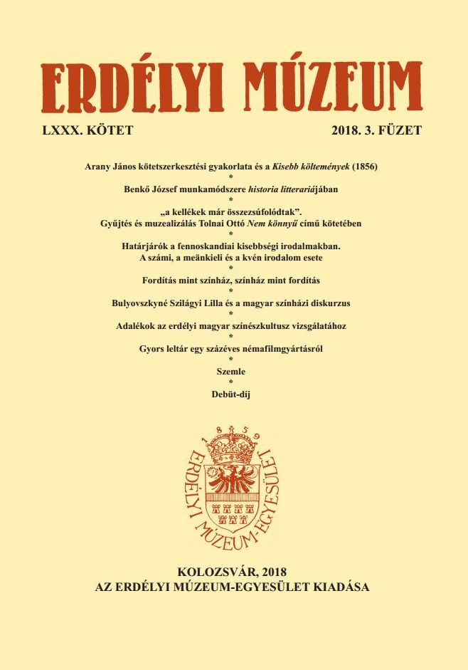 Cím: Erdélyi Múzeum 2018/3 80. Szerkesztő(k): Kovács Kiss Gyöngy (felelős szerk.), Varga P. Ildikó (szerk.) Műfaj: irodalomtörténet, színháztörténet Ismertető: